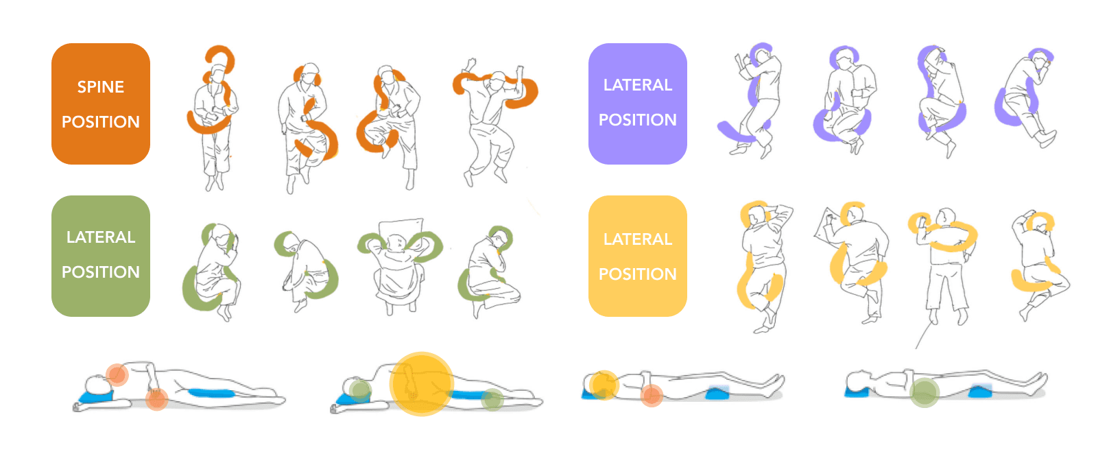 By studying various sleeping positions including Spine, Lateral, and Fetal, I sketched out the body's contours and pressure points in each posture. This ergonomic research informed the design of the DreamWeave pillow, leading to a prototype that adapts seamlessly to different sleeping styles for optimal support and comfort