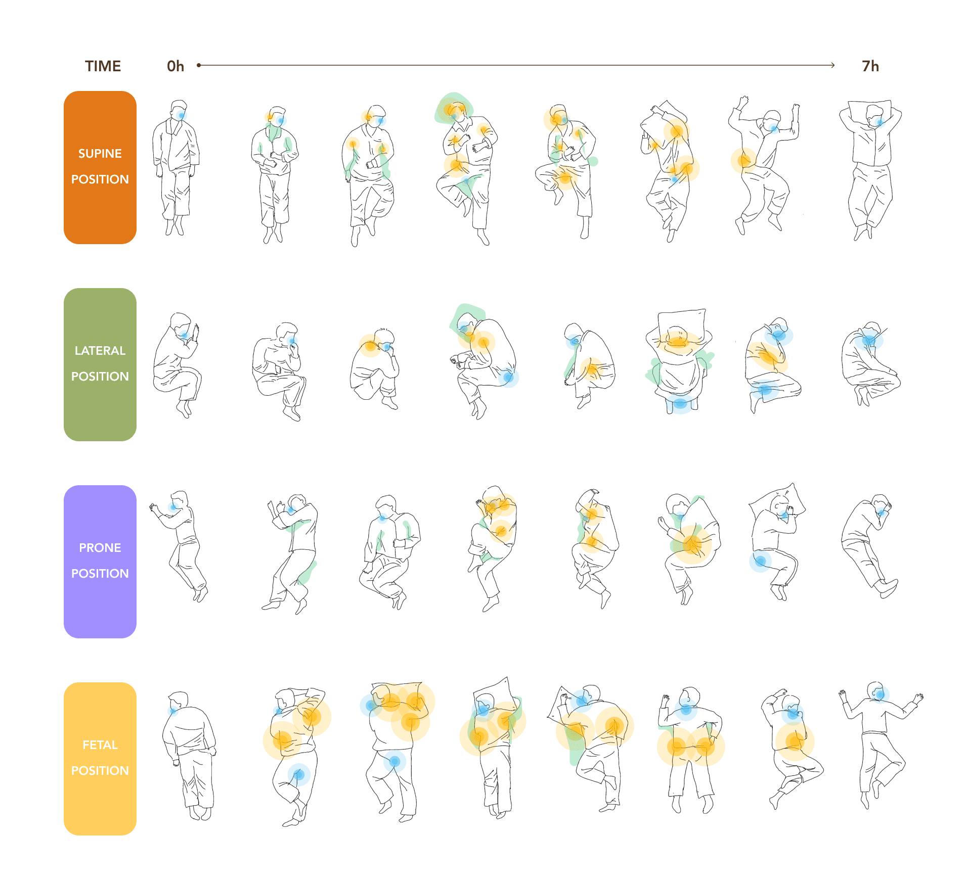 This diagram illustrates the optimal placement of temperature, humidity, and CO2 sensors in relation to a user's changing positions during sleep. It aims to identify the most effective locations for each sensor to accurately capture environmental and physiological data throughout the night.