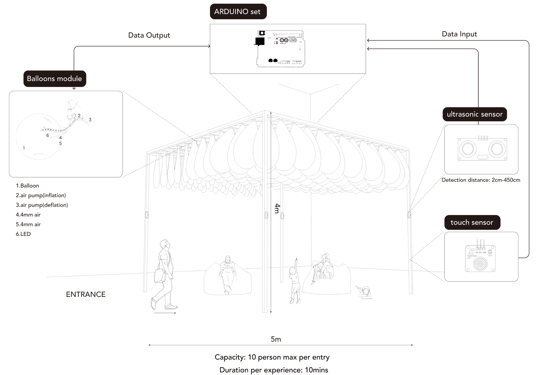 Visitors enter a 5m x 5m installation with balloon modules and responsive lighting.
