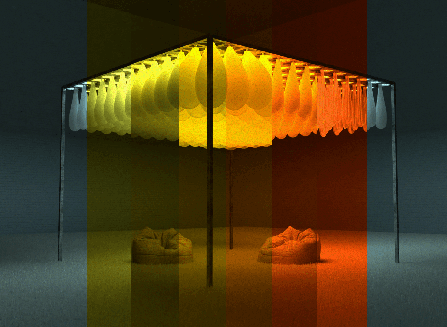 The space evolves through colors, inflation, and illumination, creating a contemplative environment to reflect on emotional states.